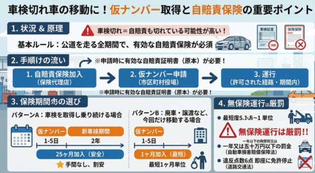車検切れの車が公道を走るには仮ナンバーが必要ですが、同時に自賠責保険の存在も忘れてはいけません。